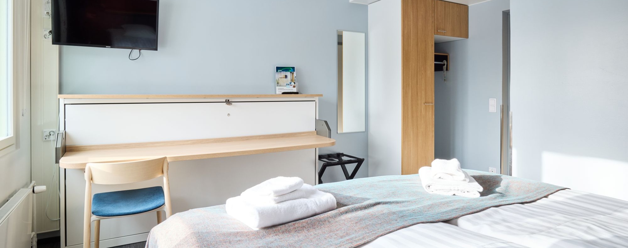 Linnasmäkis rum för tre personer har en dubbelsäng och en fast extrasäng (väggbädd). På förfrågan i förväg kan rummet även förses med en barnsäng (beroende på tillgänglighet).
